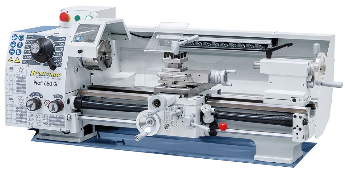 A Profi 650 G esztergagép alapfelszereltségéhez tartozik egy vezető- és húzóorsó menetvágáshoz, ill. az automatikus hosszanti- és haránt előtoláshoz. A 12-fokozatú sebességváltómű lehetővé teszi a fordulatszámok gyors beállítását, így nincs szükség ékszíjváltásra. Kompakt felépítése és nagy önsúlya által ez a gép nagyon nyugodt futást eredményez és ezáltal precíz munkavégzést garantál.
